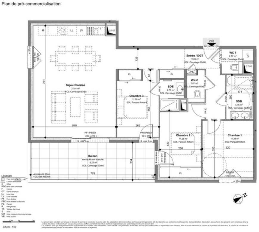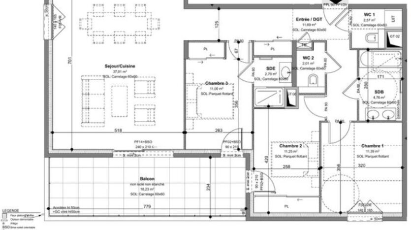 Le séjour/cuisine spacieux de 37,01 m2 est parfait pour recevoir. Les grandes baies vitrées ouvrent sur le balcon de 18,23 m2, idéal pour se détendre. Les trois chambres sont confortables et disposent de rangements intégrés. La salle de bains moderne et les deux WC séparés ajoutent au confort de cet appartement.