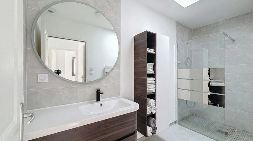 La grande baie vitrée du séjour et le velux motorisé de la salle de bains créent une atmosphère douce, reliant harmonieusement intérieur et extérieur.