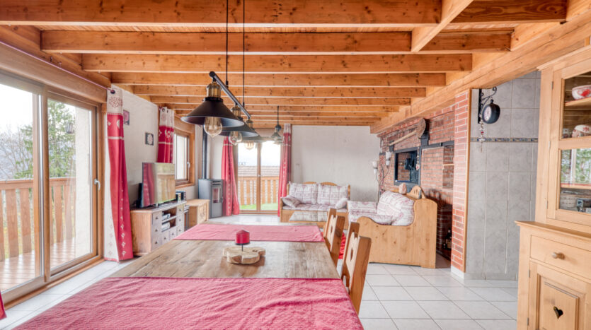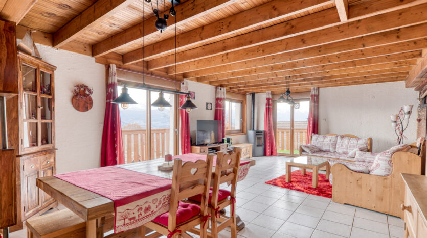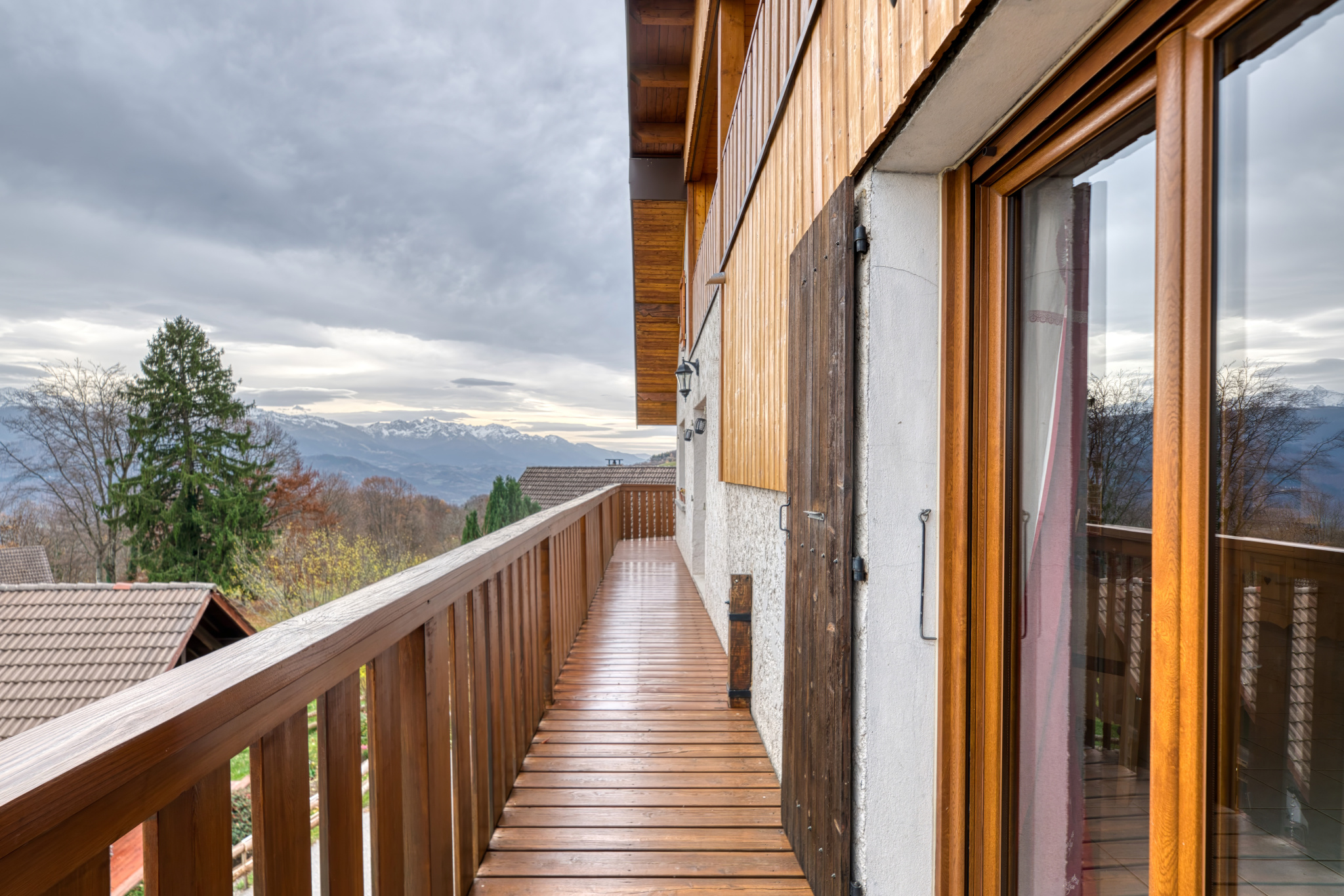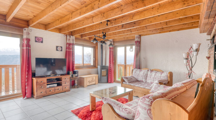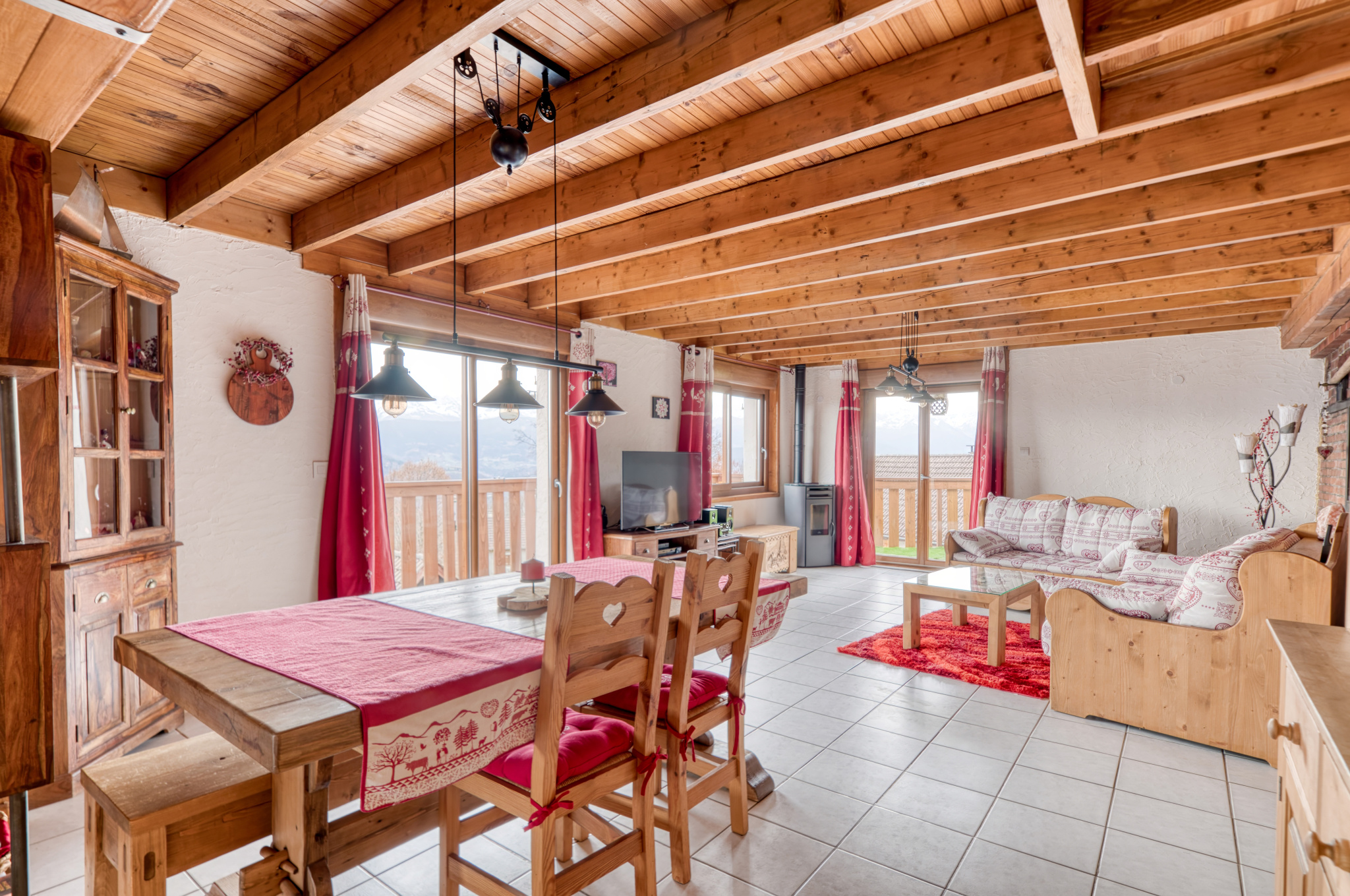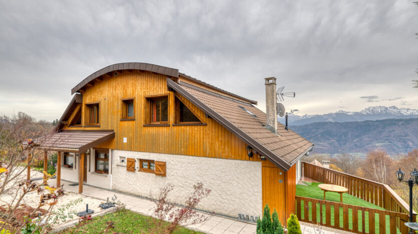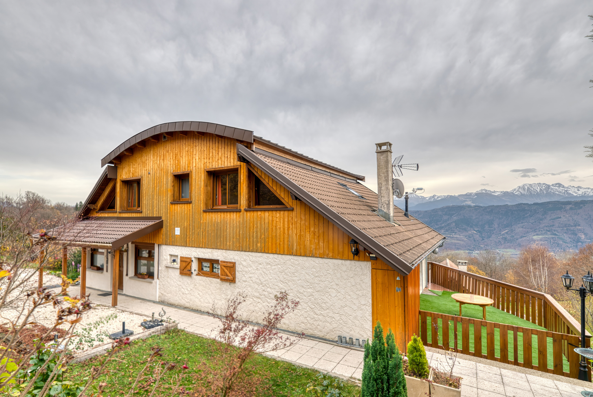 Sa toiture courbe entièrement rénovée en zinc joint debout lui apporte une allure de chalet contemporain, parfaitement intégrée dans le paysage alpin. Orientée pour capter la lumière, elle profite d’une vue dégagée et panoramique sur les massifs.