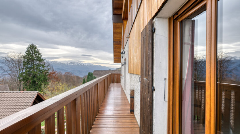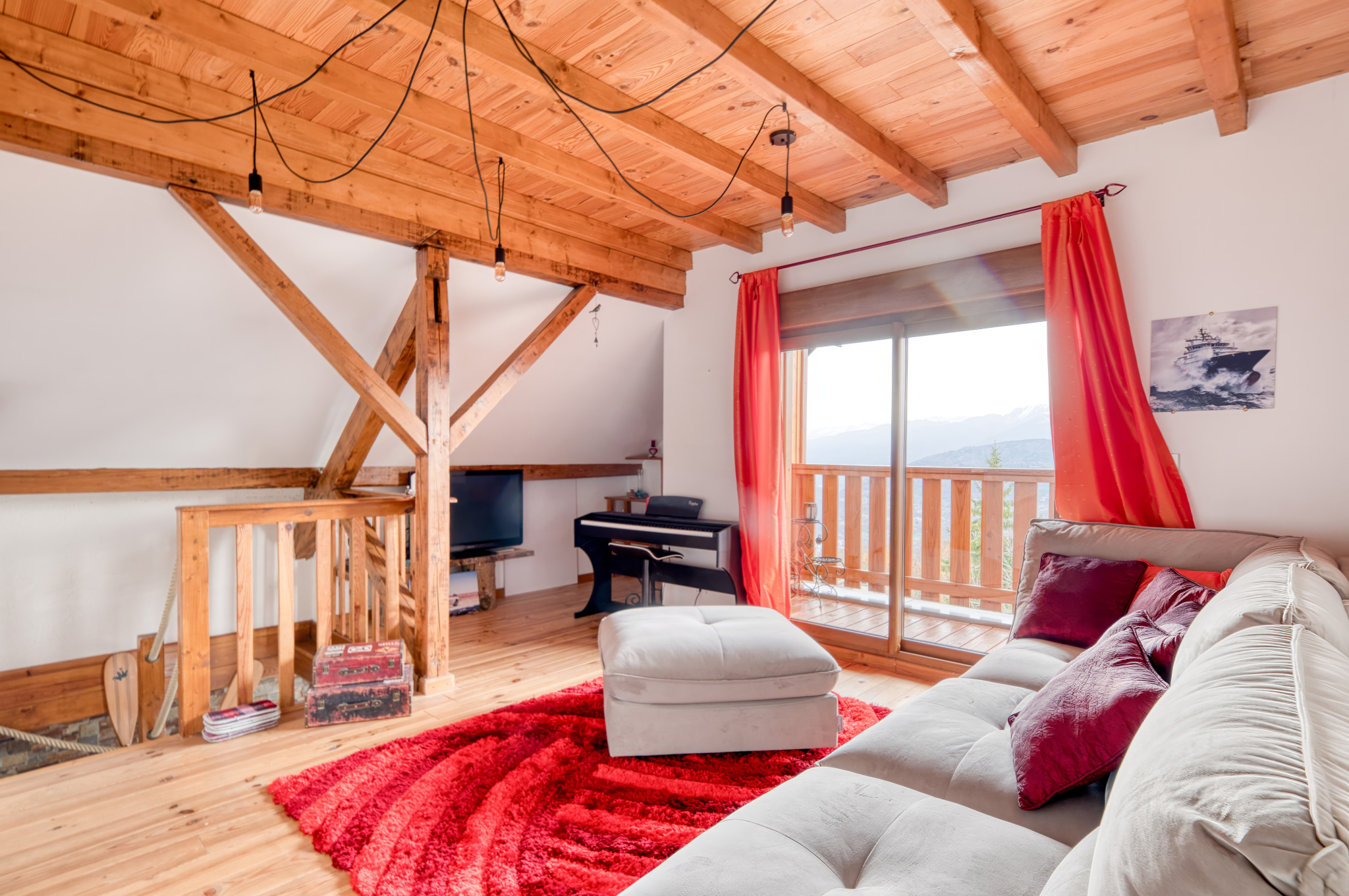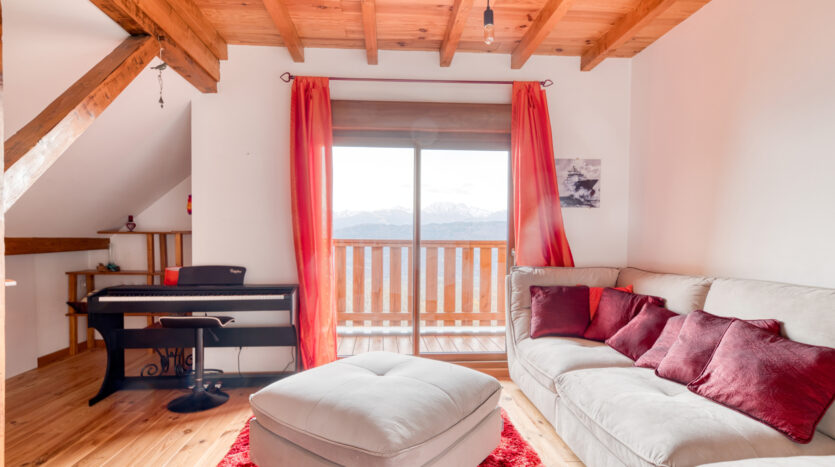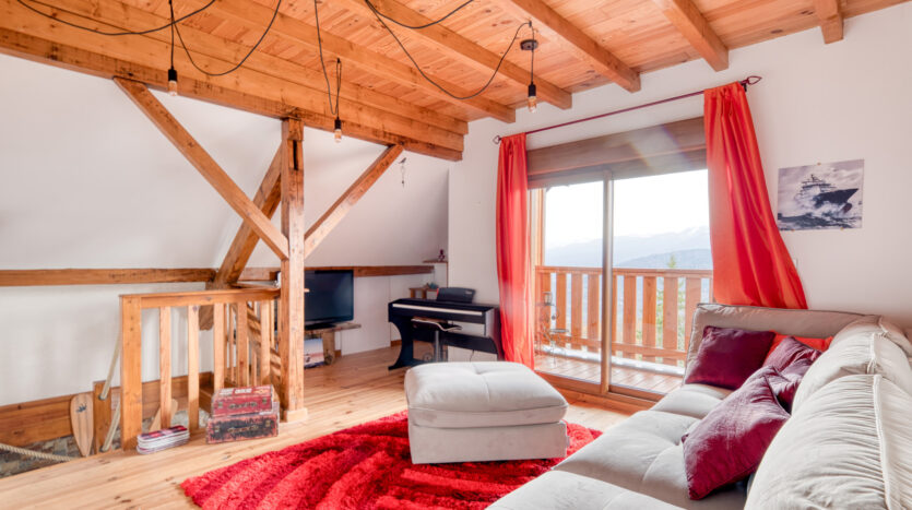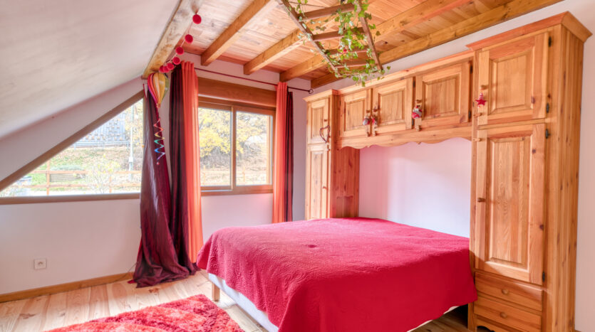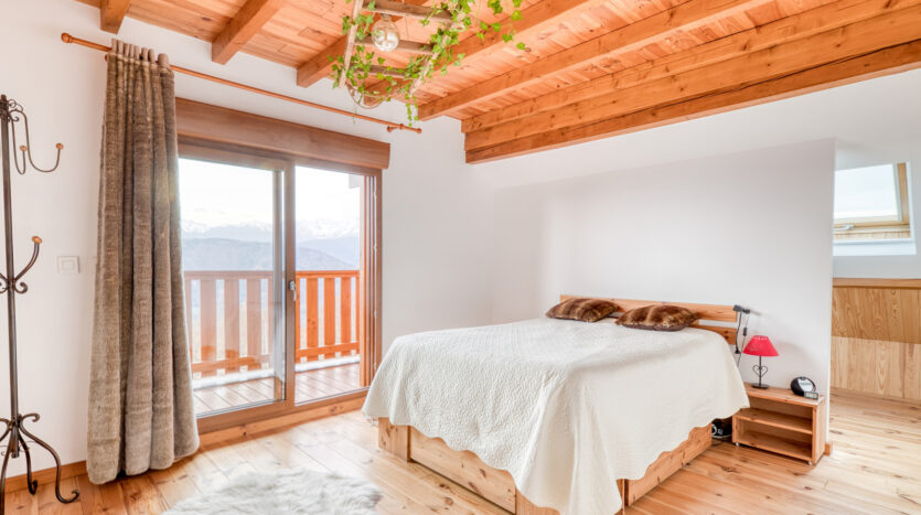 Toutes décorées de chaleureux planchers en bois massif. L’une d’elles, façon suite cocon, bénéficie d’un plafond rampant à poutres apparentes et d’une large baie vitrée coulissante ouvrant sur un balcon avec vue montagne.