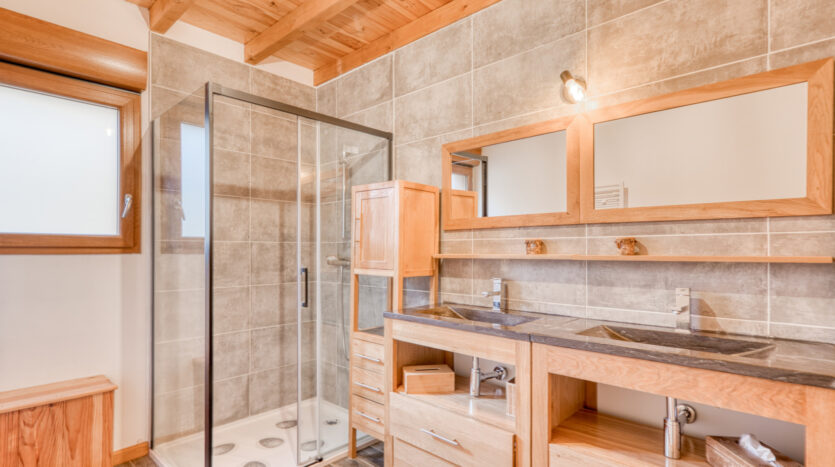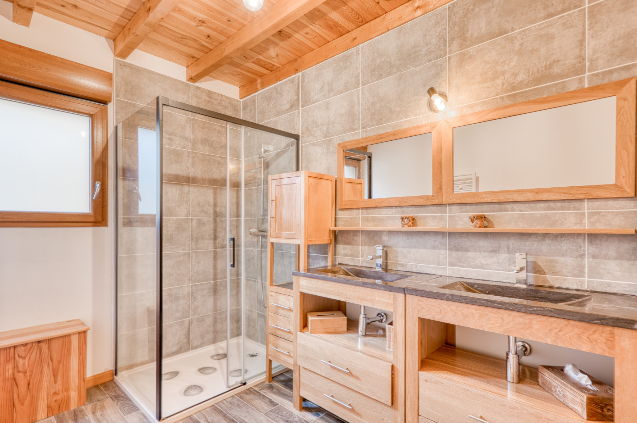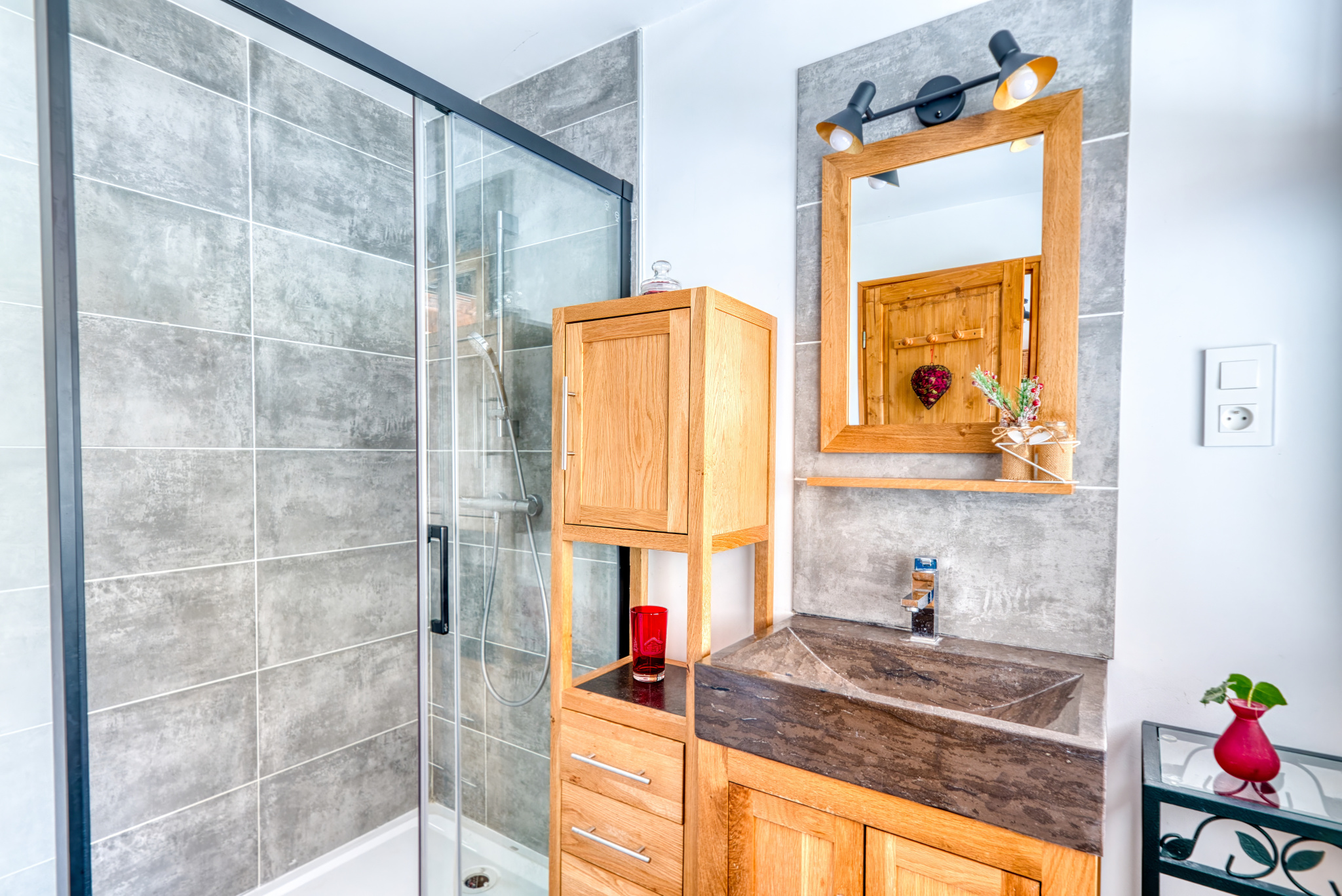 Grande douche vitrée Meuble double vasque en bois massif Carrelages grands formats effet pierre (La maison compte 3 WC).